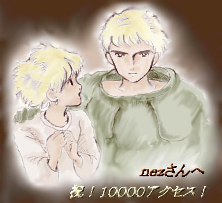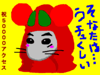 作者より........nezさんのつもり。つもりつもり・・・。とにかく、おめでたうでござる。解説ねずちゃんのページ50000カウント記念としていただきました。今回は・・・あは(*^^*)アシタカがnezになっています(^^;;全国のアシタカファンが暴動を起こすかも(爆)冗談はさておき、びっくりなことにアニメGIFなのです。あれ?(^^;ってまんまとHANAさんの策略にはまったのでした(^^; このCG見て、顔がにやけてしまったよぉぉ(^^;;; 今回で記念CGも10作目&HANAさん自身が50000カウントゲットという、記念に記念が重なりまくっている−思わず顔がほころんでしまう−作品を有り難う! |