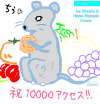 作者より甘党のnezさんのために果物をいっぱい描きました。解説フォーラム開設135日目の11/20、ついについにアクセス数10000を突破しました!その記念として、あのRimloさんがnezの姿(?)を描いて下さいました!あの手に持っているのはなんでしょうね?(^^) 僕が甘党なのを知られてしまった(^^;でも、果物がなんでも好きなわけではないんですけど(^^;;;; ほのぼのとした絵を描いて下さった、Rimloさん!ありがとう!! |